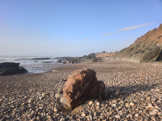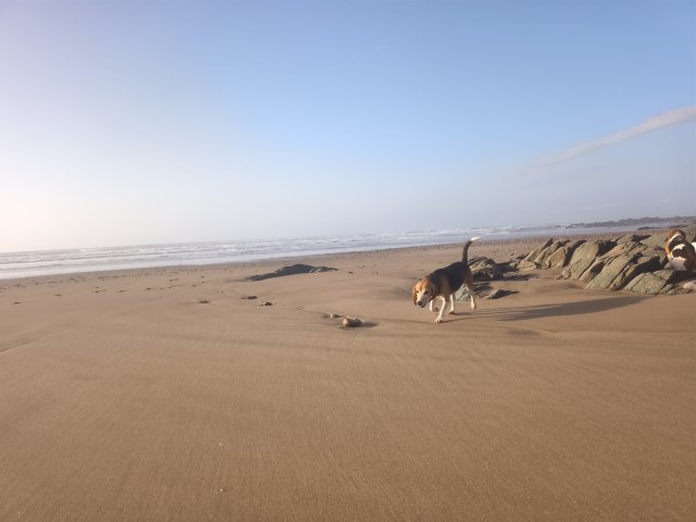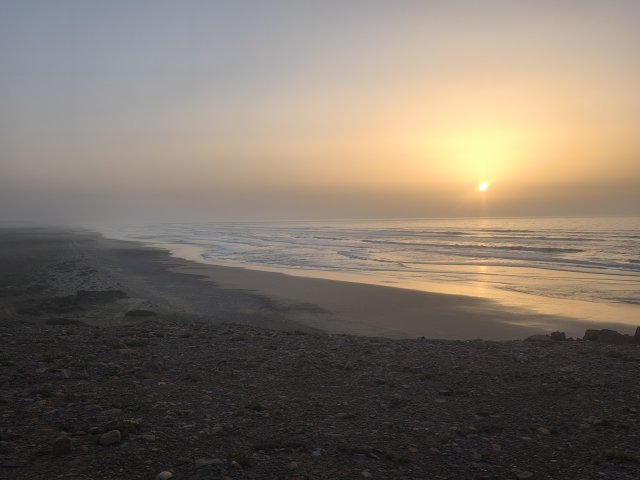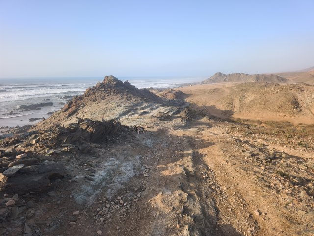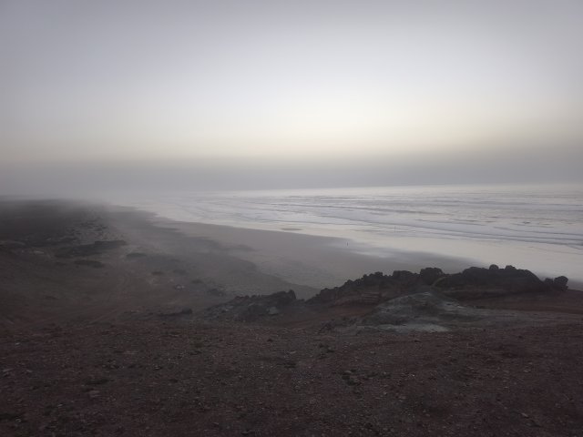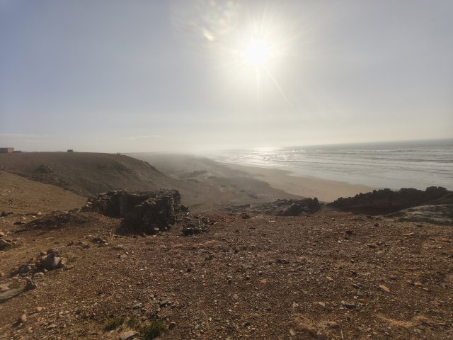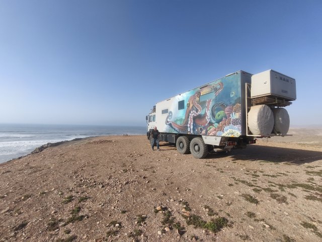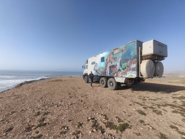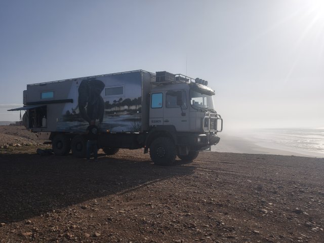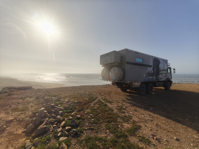 Hier startet für viele Offroader der Weg über den Plage Blanche welcher nur bei Ebbe befahrbahr ist. Für EleOcti mit 12 meter Länge und 22 tonnen Gewicht wäre dies wohl eine echte herrausforderung. Ich habe mich aus 2 Gründen dagegen entschieden. Erstens riskiere ich nicht den Wagen für ein kurzes Abenteuer und zweitens wäre der Abstieg nur mit einem komplizierten Millimeter Manöver um die Felsen möglich. Mit dem Elektro Cross Motorrad hatte ich auch so viel Spaß am Strand.