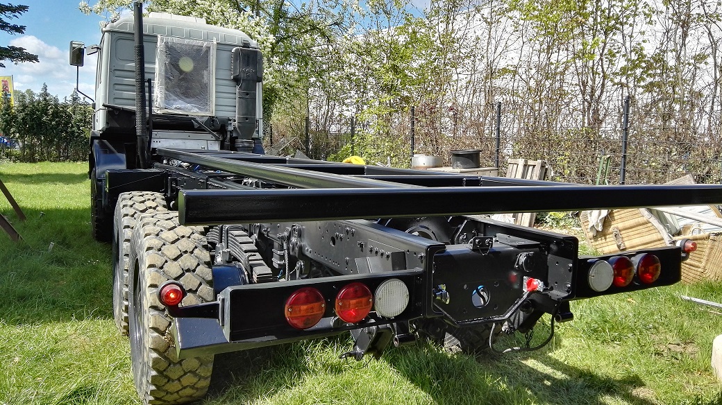 Der Hilfsrahmen wird durch 4 Lufbälge stabilisiert welche vom Fahrerhaus je nach Untergrund (Strasse / Piste / Sand) eingestellt werden können. Angenehm ist auch das man sich bei einem Standplatz zumindest in der Längsachse waagerecht ausnevelieren kann.